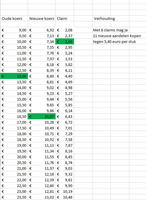 oor 8 oude aandelen krijg je recht op 11 nieuwe aandelen à €5,40. Die claimrechten hoef je niet uit te oefenen, maar kun je ook op de beurs verkopen. Dan gaat iemand anders ze uitoefenen.