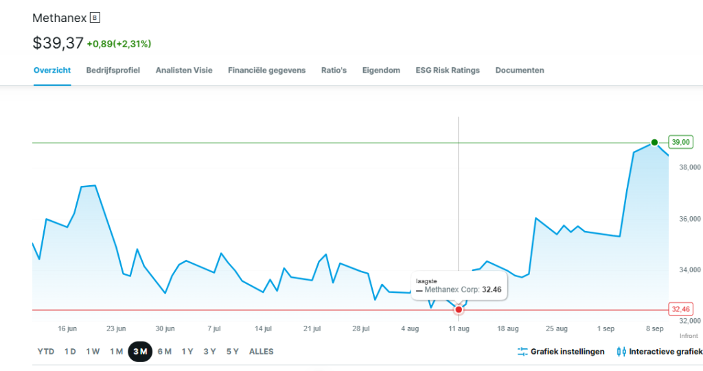 Maar liefst 9.9 miljoen stuks, die destijds 42 dollar per stuk deden. Je ziet hieronder de koersvorming van Methanex. Die daalde fors de afgelopen periode en dat met ook nog eens een dalende dollar, betekende serieuze schade voor OCI.