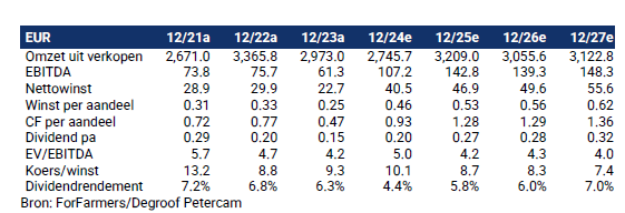 Analist Fernand de Boer van Degroof Petercam heeft een koopadvies staan op ForFarmers met een koersdoel van 6,40 euro.