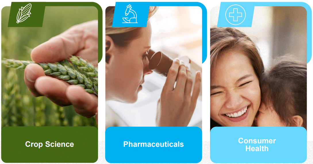 De twee grootste, Crop Sciences en Pharmaceuticals, zijn elk goed voor zo’n 45% van de omzet.