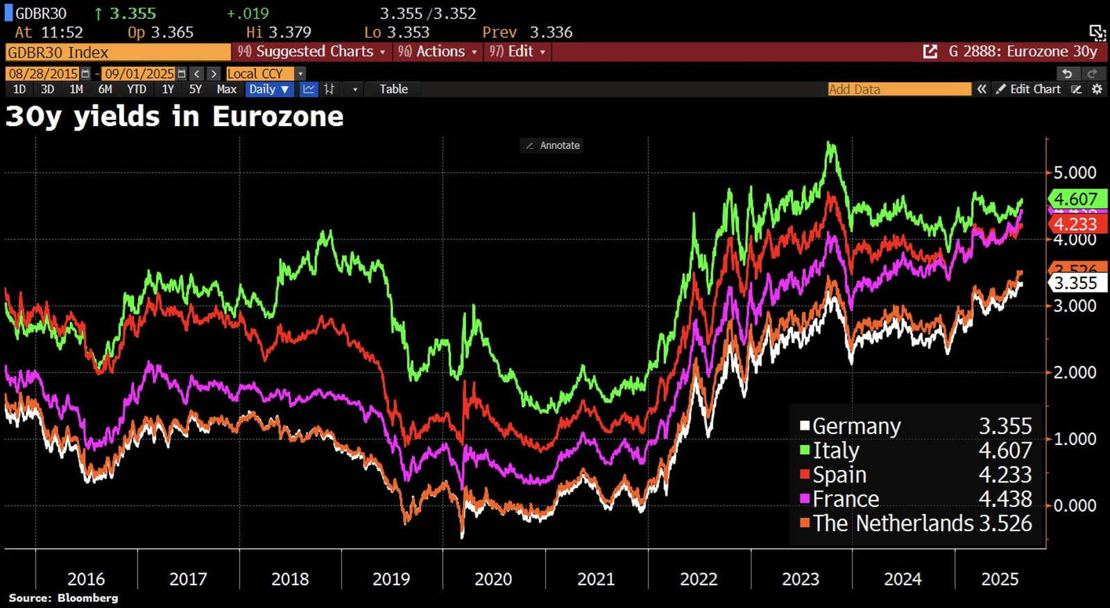 Nu al is de 10-30 jaar rentecurve in Nederland met bijna 50 basispunten gestegen – de sterkste stijging binnen de eurozone. Duitse en Franse 30-jaarsleningen noteren op meerjarige hoogtes. Minder vraag van Nederlandse fondsen betekent dat staten die lange leningen uitgeven hogere rentes moeten bieden.