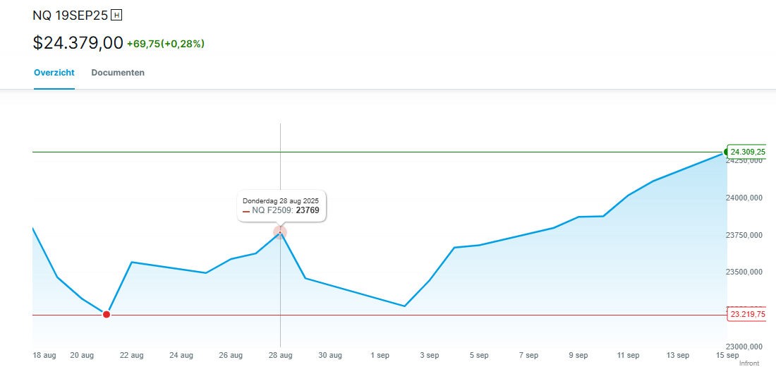 Hieronder zie je de future op de Nasdaq 100. Ook hier, vanaf 2 september, een opgaande lijn. Ondertussen verzwakt de dollar verder, wat de stijging nog wat meer aanzet.