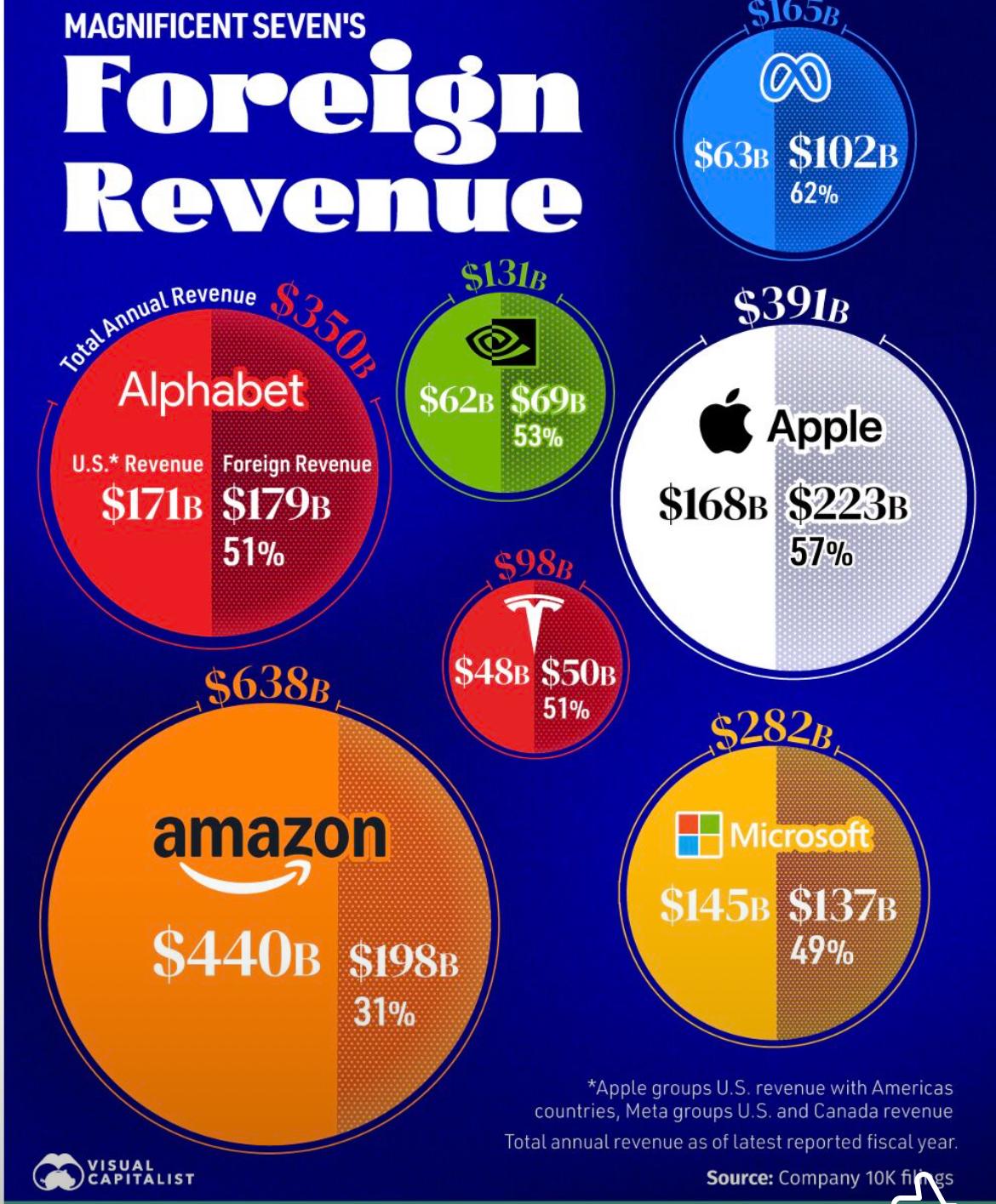 De arbeidsmarktcijfers zijn slecht, maar de bestedingen van de Amerikanen zijn nog steeds goed en ook het GDP wordt voorzien op 3% in Q3. Bovendien heeft het Amerikaanse bedrijfsleven voordeel van de zwakke dollar. Niet bij de import, maar wel bij de omzet die ze overzees halen. En dat is niet gering, zie hieronder de Magnificent 7: