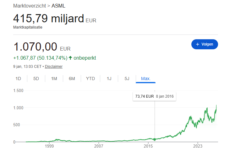 Deze week bereikte de koers van de Veldhovense chipmachine fabrikant een nieuw hoogtepunt van 1070 euro, wat een marktkapitalisatie betekent van 416 miljard euro. In tien jaar tijd steeg het aandeel van 74 euro naar nu 1072 euro.