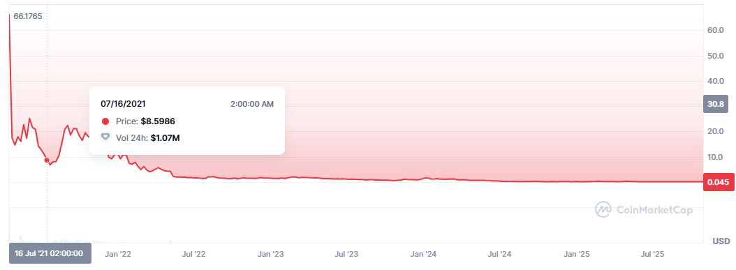 Dit PDEX is dus ook het symbool voor een altcoin, ook wel shitcoin genoemd in de volksmond, die het niet lekker doet. Het gaat om Polkadex, dat ook PDEX als ticker heeft. Polkadex was erg populair in 2021 maar van die 66 dollar destijds is niet zo heel veel meer overgebleven. Hier onder zie je de chart van dat altcointje.